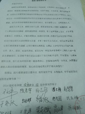 近期,在我校110周年校庆来临之际,各班为深入贯彻感恩、诚信的思想精神,依照学院要求,组织班级同学在班级内召开关于”感恩、诚信“的主题班会,并进行深入探讨。会后,各班进行了“”感恩·诚信倡议书“的宣誓和签名活动。