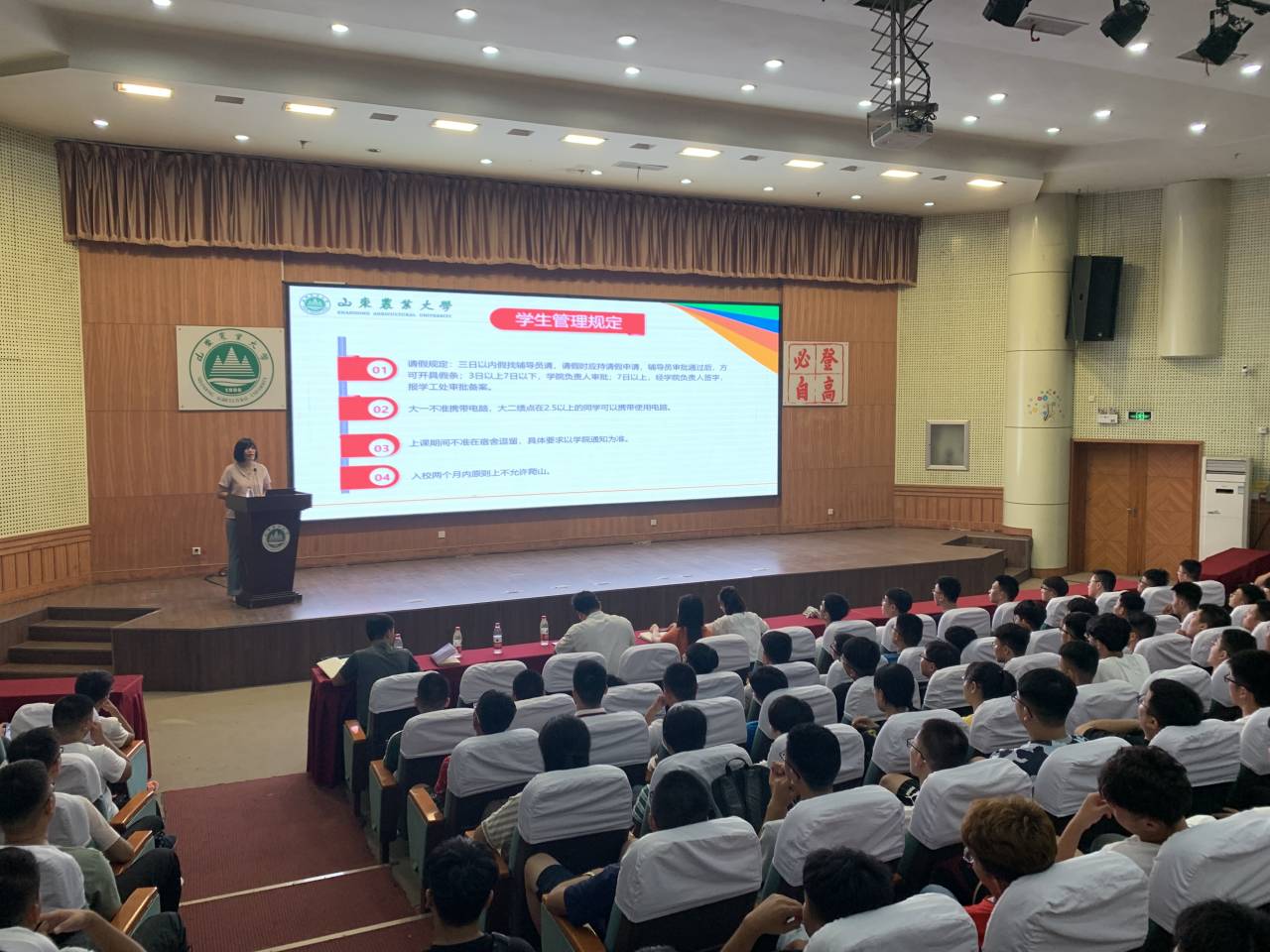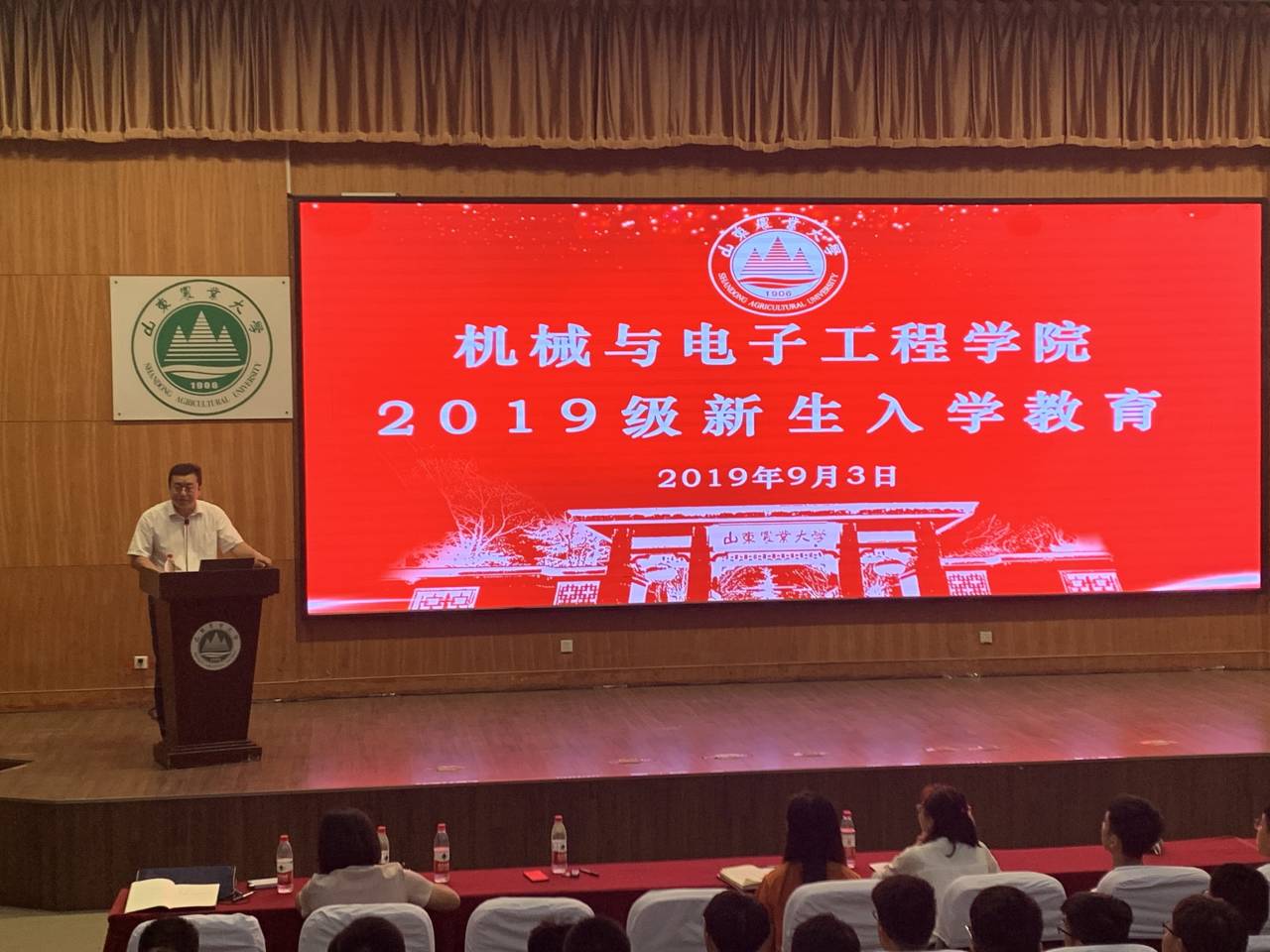新生辅导员单建峰主持报告会,全体辅导员和19级全体新同学参加报告会。