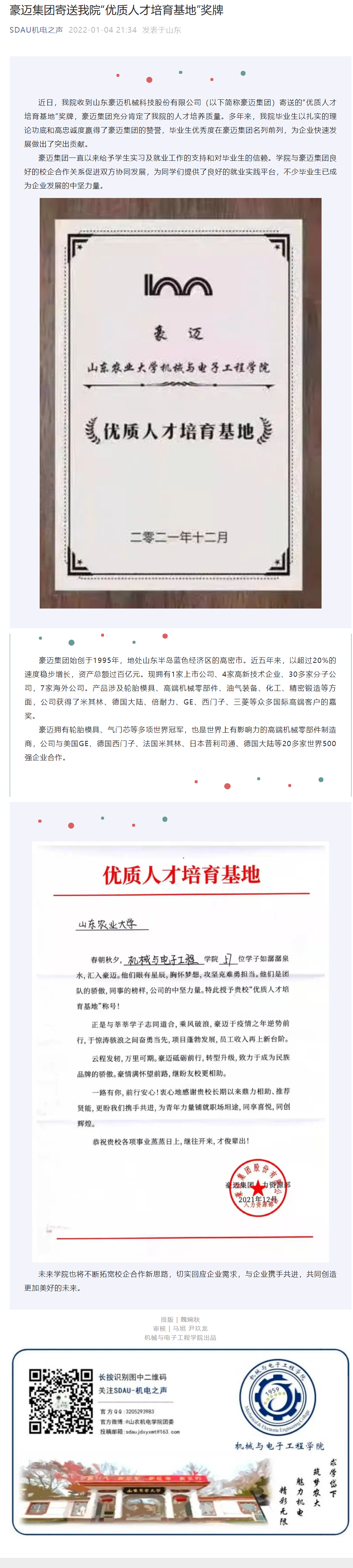 豪迈集团寄送我院“优质人才培育基地”奖牌