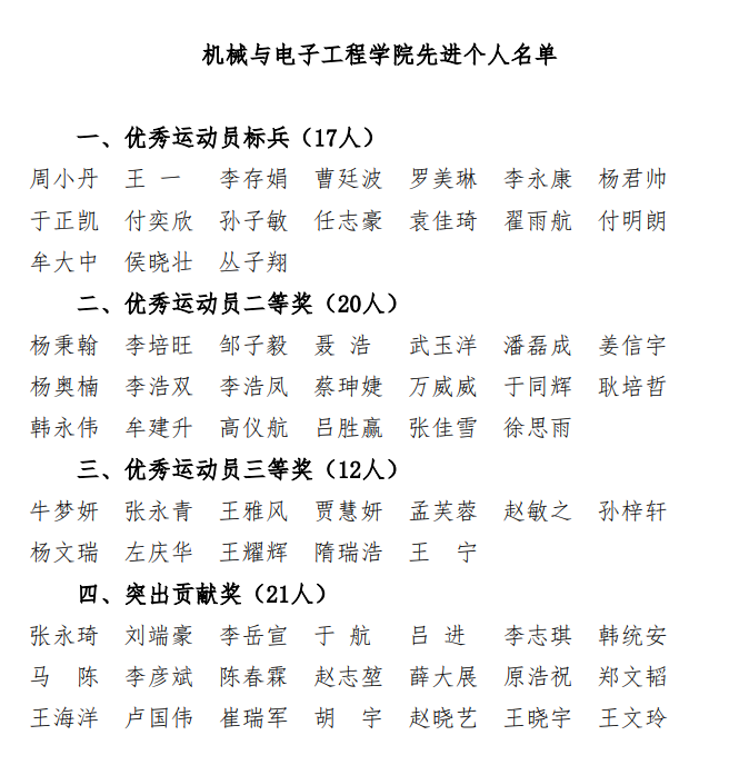 为树立典型、鼓励先进、凝聚力量、总结经验,进一步激励机电学子奋发有为,授予孙子敏等17位运动员“优秀运动员标兵”称号,授予杨秉翰等20位运动员“优秀运动员二等奖”称号,授予牛梦妍等12位运动员“优秀运动员三等奖”称号,授予吕进等21位运动会工作者“突出贡献奖”称号,颁发荣誉证书并发放奖品。