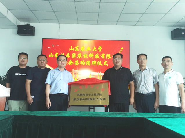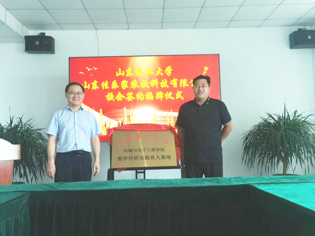 佳乐家农牧科技有限公司副总经理孙启寿和机电学院党委副书记杜洪涛签署合作协议,佳乐家农牧科技有限公司总经理王涛和机电学院院长王金星为“山东农业大学教学科研实践育人基地”揭牌。揭牌仪式结束后,共同参观了佳乐家农牧科技有限公司的二期、三期养殖工厂和绿色种植基地。