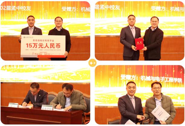 12月5日,机电学院在文理大楼报告厅隆重举行青岛瑞和农牧奖学金捐赠仪式,此奖学金由学院02届校友、青岛瑞和农牧设备有限公司董事长、总经理孟中出资15万元设立,主要用于激励与支持学院学生学术研究、科技创新、文体活动等多方面发展。校友孟中、青岛瑞和农牧设备有限公司代表、学院院长王金星、党委副书记杜洪涛、副院长宋月鹏、办公室主任孔庆国、学院辅导员、学生代表出席活动,团委书记尹玖龙主持活动。