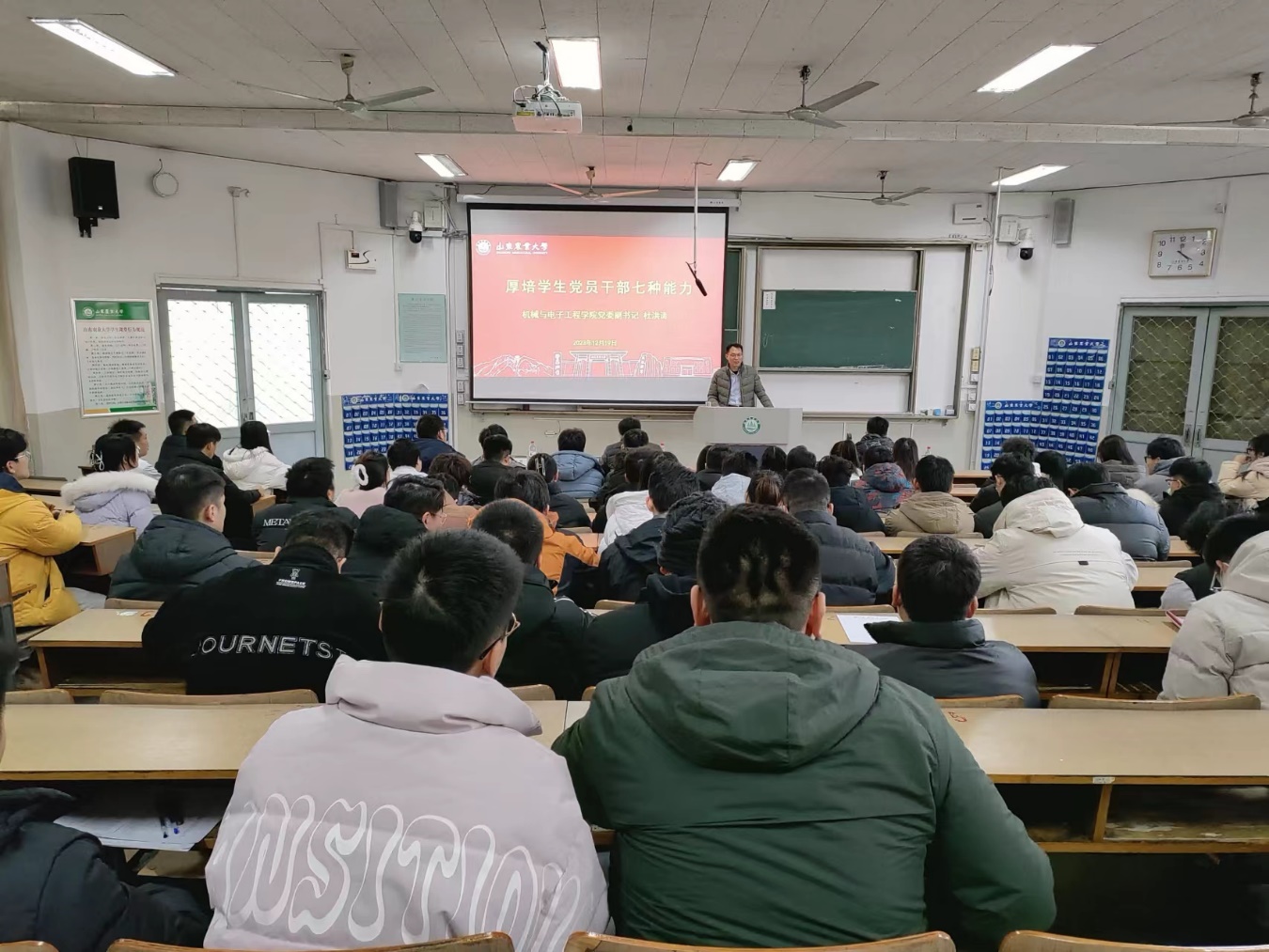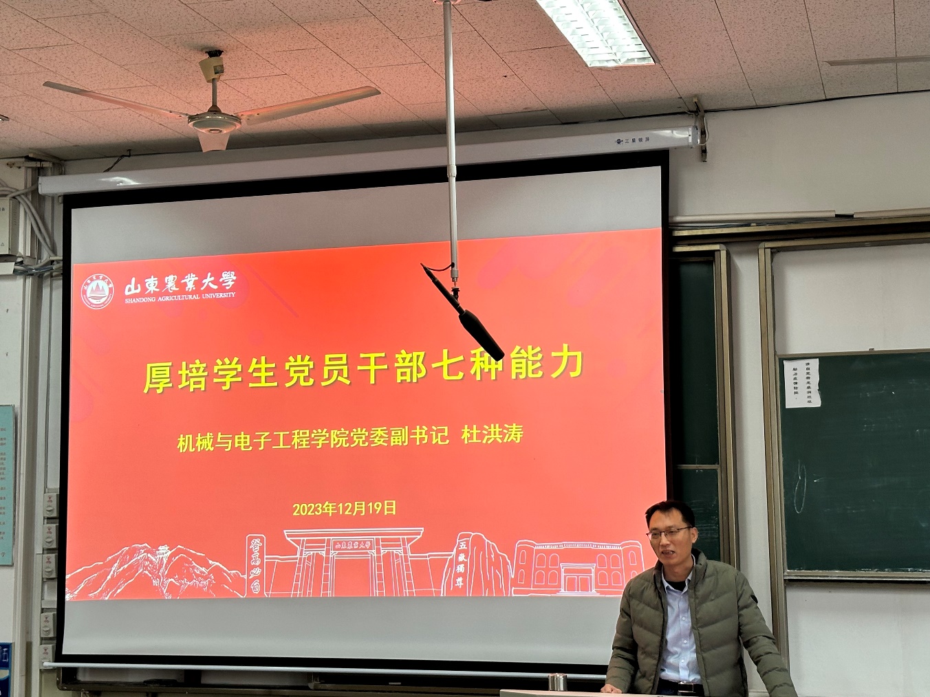 12月19日下午,机械与电子工程学院党委副书记杜洪涛以《厚培学生党员干部七种能力》为题为学院全体研究生党员讲授党课。三位研究生党支部书记刘林、刘树峰、吴彦强及全体研究生党员参加了授课。