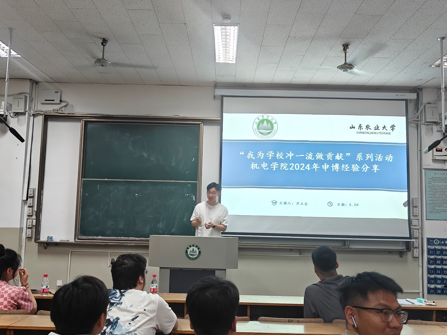 5月20日晚7:30,机电学院2024届优秀毕业博士科研心得分享暨优秀毕业硕士考博、考公经验分享会在岱宗校区5N301顺利举办。本次活动邀请到了两位优秀博士毕业生以及三位优秀硕士毕业生为大家分享经验和心得,活动由研究生辅导员吴彦强主持,全体研究生参加了活动。