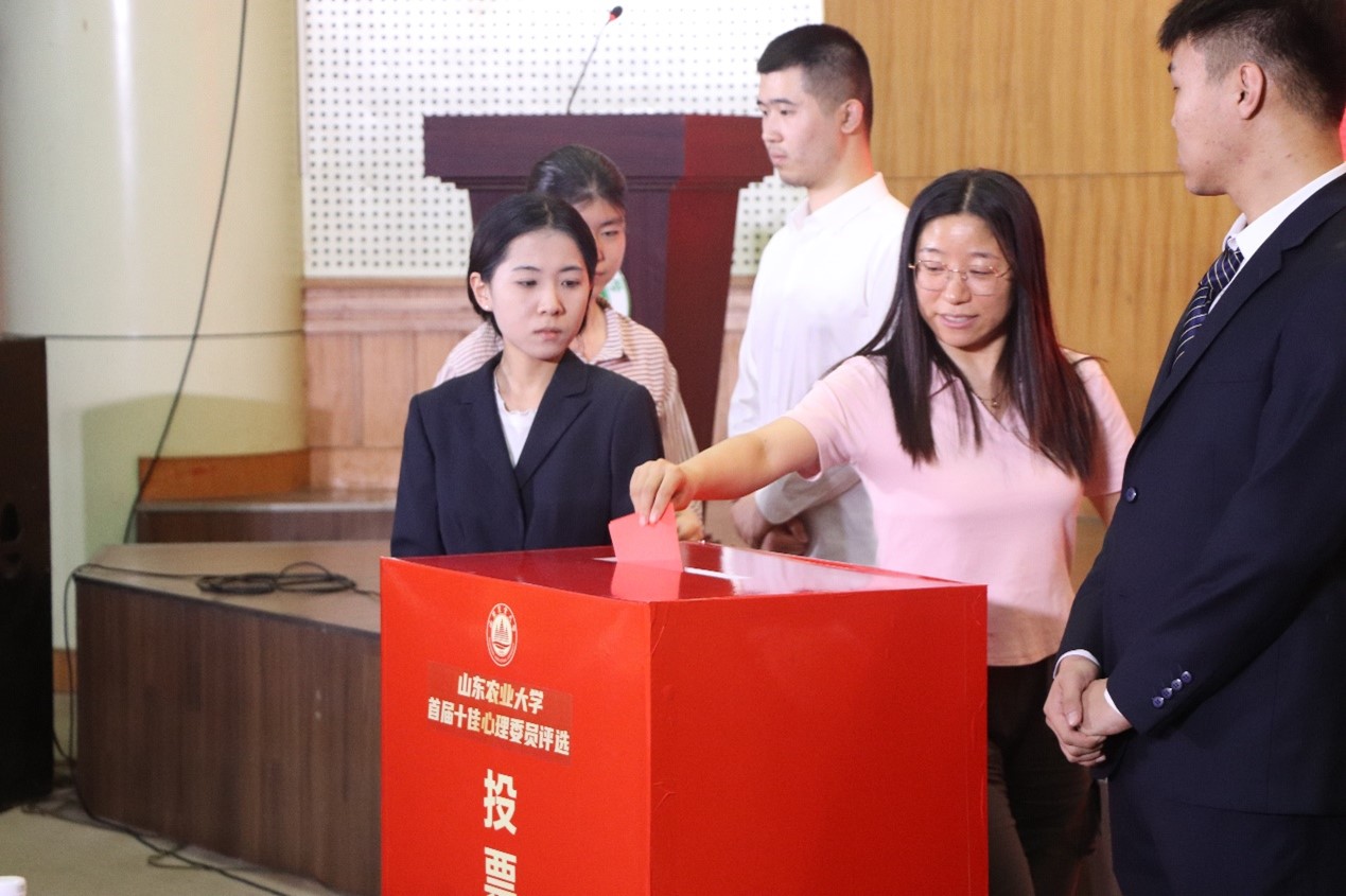 各位候选人答辩后,进入投票、计票环节。本次大会评审团由教师评审团和学生评审团组成。其中,教师评审团由心理中心心理教师和学院心理辅导员组成;学生评审团由各学院学生代表(15名心理委员)组成。