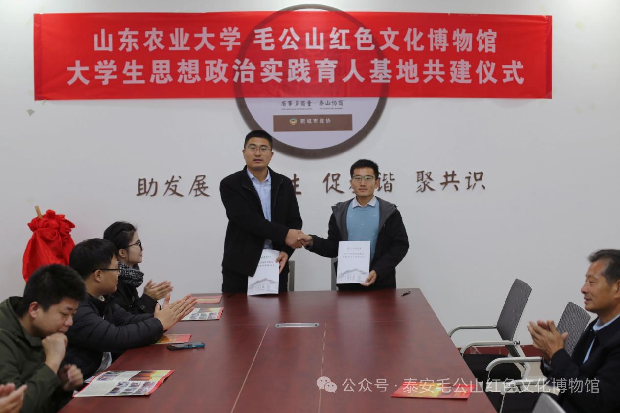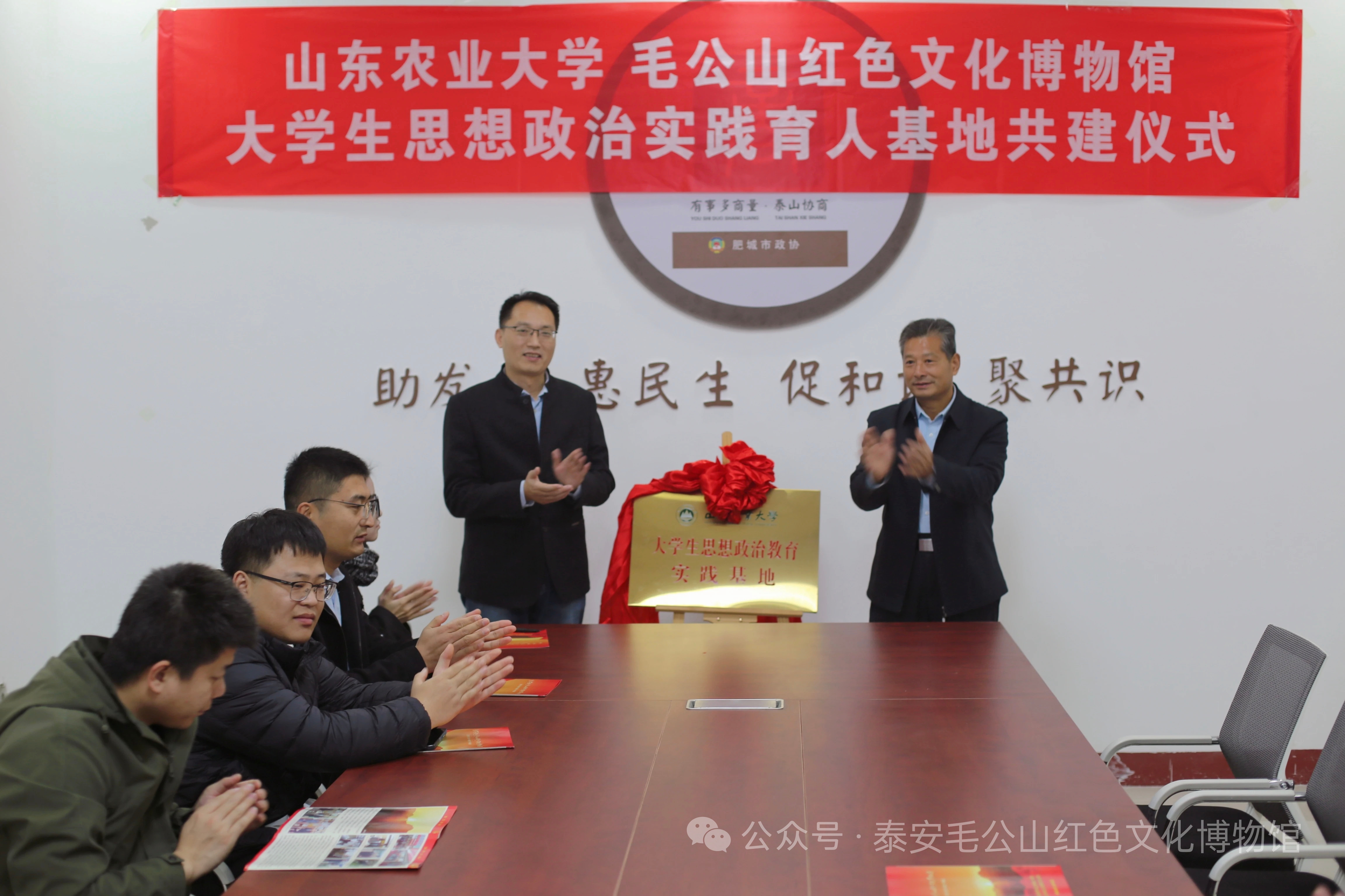 为深入贯彻习近平总书记“用好红色资源、赓续红色血脉”的重要指示精神,激活红色资源育人效能,将红色文化转化为思政教育“活教材”,共建馆校协同育人平台,推动“大思政课”实践创新发展,10月31日,山东农业大学与泰安毛公山红色文化博物馆联合举办大学生思想政治实践育人基地共建仪式。