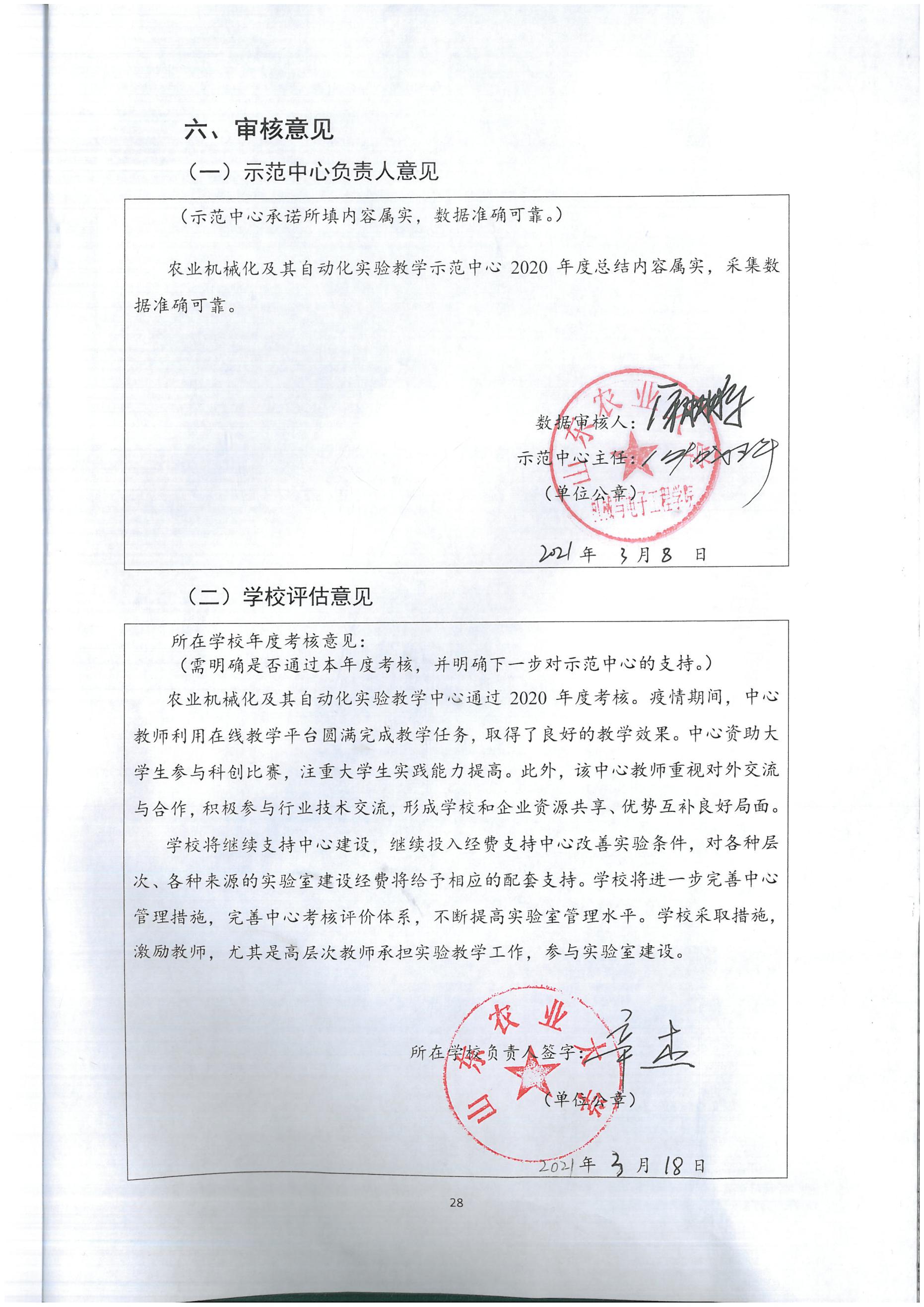 所在学校年度考核意见: (需明确是否通过本年度考核,并明确下一步对示范中心的支持。) 农业机械化及其自动化实验教学中心通过2020年度考核。疫情期间,中心教师利用在线教学平台圆满完成教学任务,取得了良好的教学效果。中心资助大学生参与科创比赛,注重大学生实践能力提高。此外,该中心教师重视对外交流与合作,积极参与行业技术交流,形成学校和企业资源共享、优势互补良好局面。 学校将继续支持中心建设,继续投入经费支持中心改善实验条件,对各种层次、各种来源的实验室建设经费将给予相应的配套支持。学校将进一步完善中心管理措施,完善中心考核评价体系,不断提高实验室管理水平。学校采取措施,激励教师,尤其是高层次教师承担实验教学工作,参与实验室建设。 所在学校负责人签字: (单位公章)
