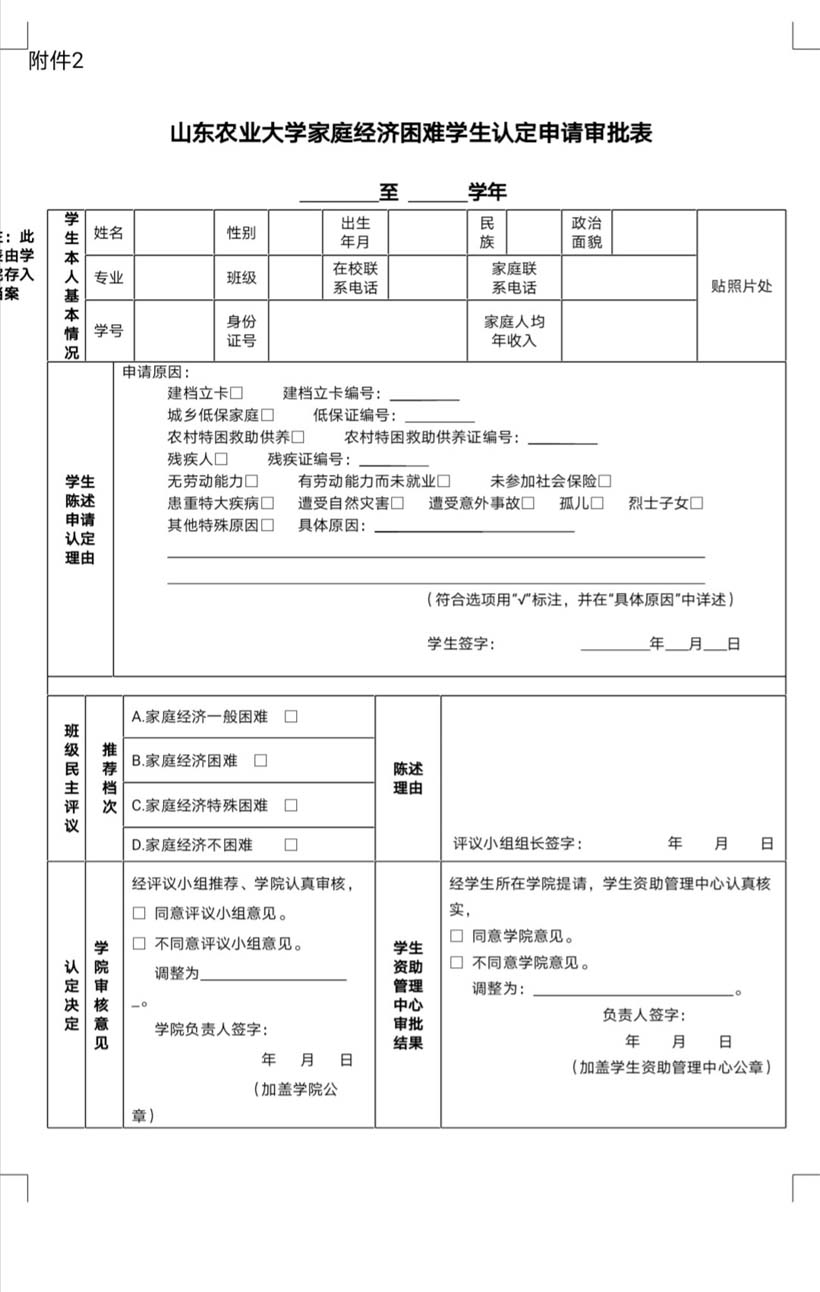 山东农业大学家庭经济困难学生认定申请审批表