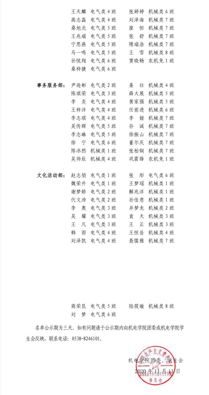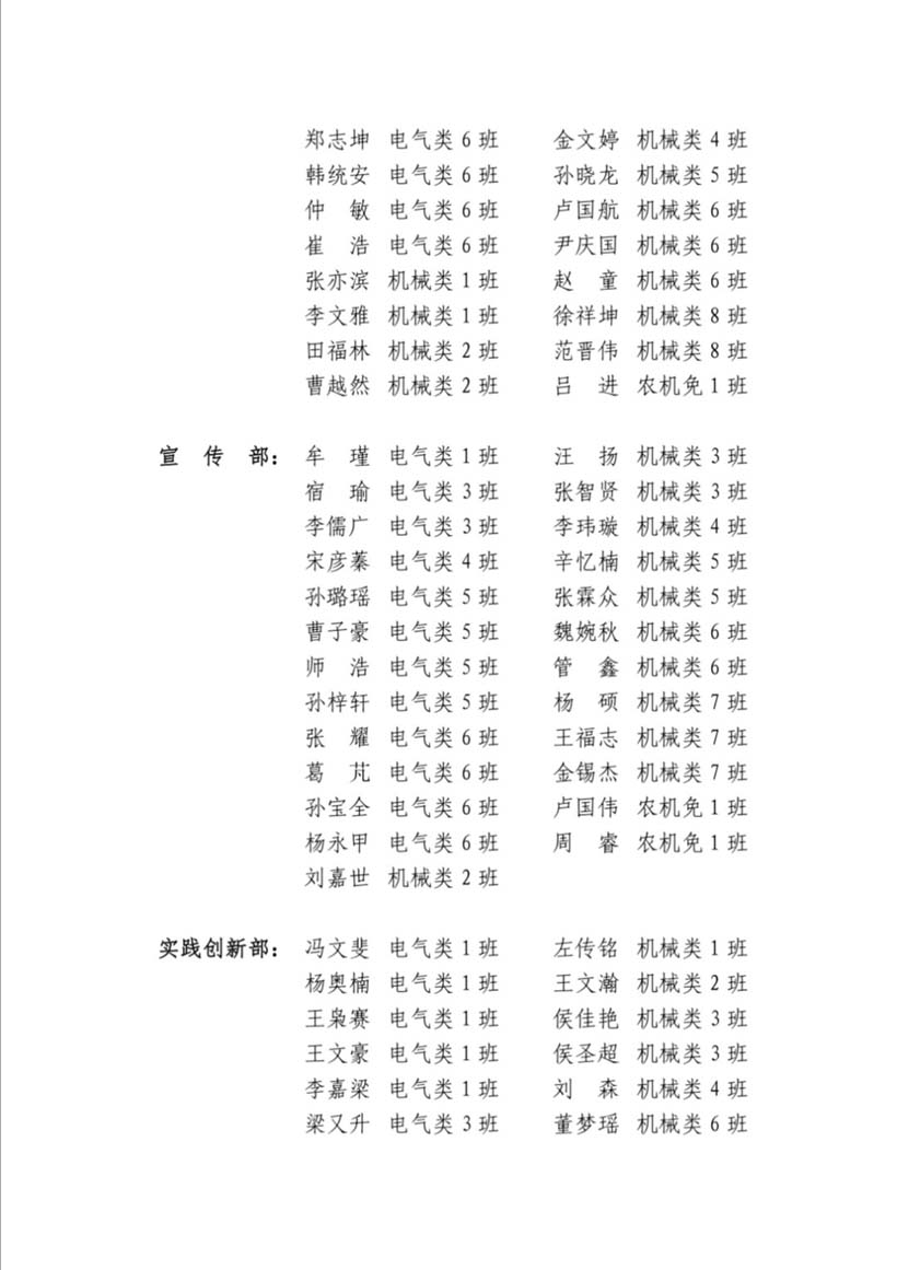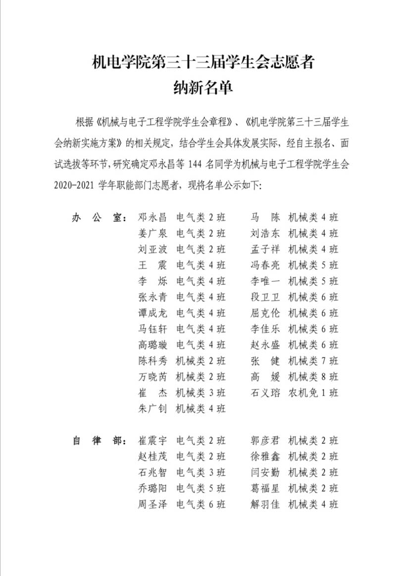 机电学院第三十三届学生会志愿者纳新名单