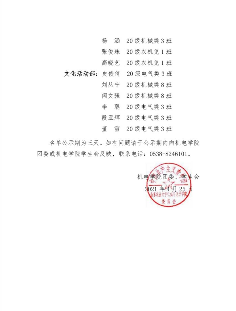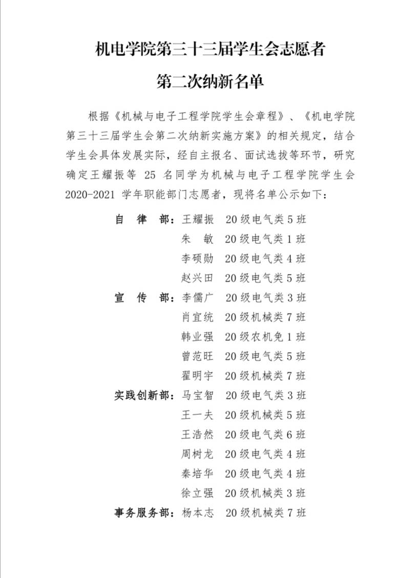 机电学院第三十三届学生会志愿者第二次纳新名单