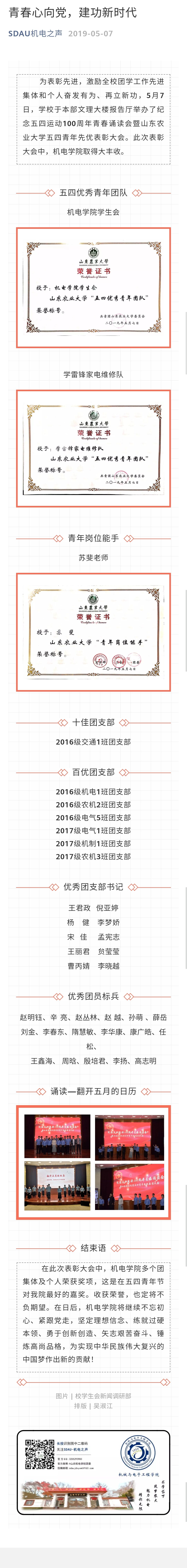 机电学院在纪念五四运动100周年青春诵读会暨山东农业大学五四青年先优表彰大会中受 到表彰