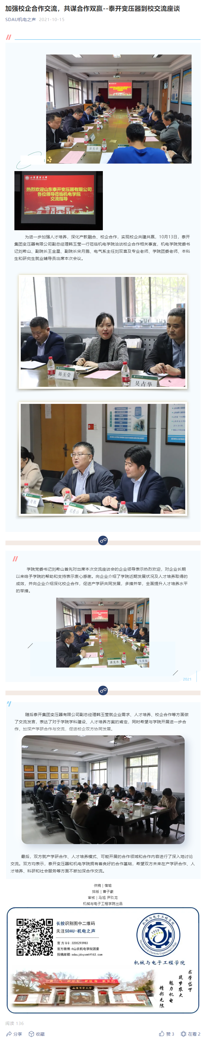 加强校企合作交流,共谋合作双赢--泰开变压器到校交流座谈