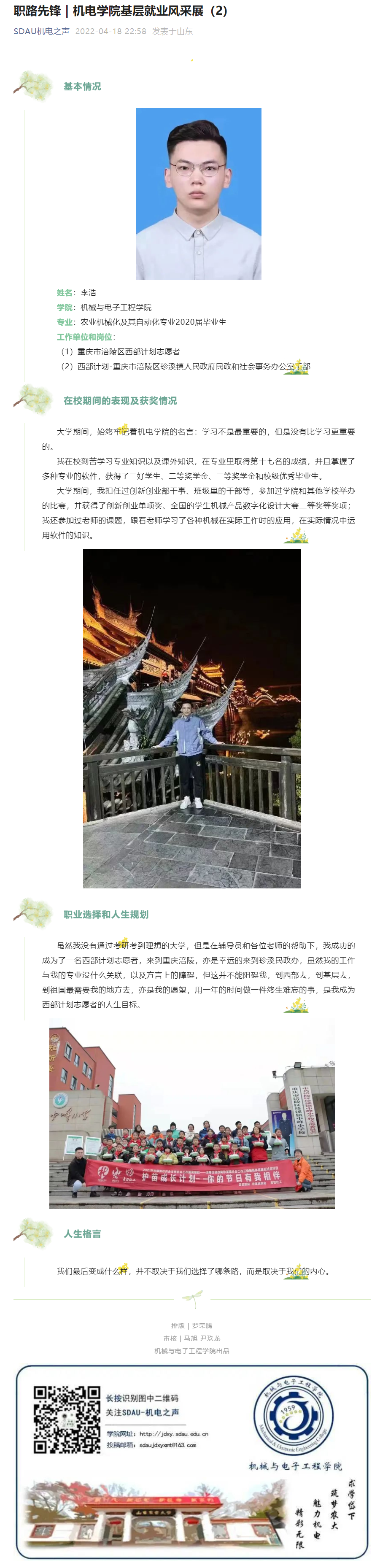 职路先锋 | 机电学院基层就业风采展(李浩)
