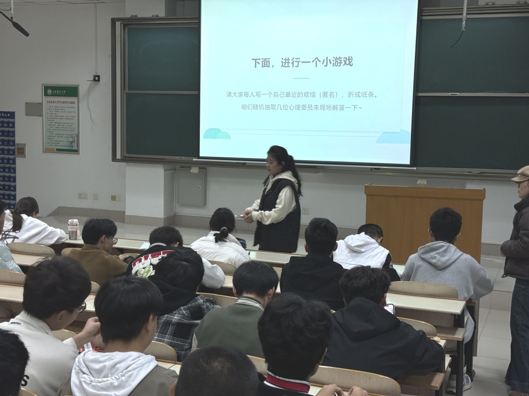 第二环节:现场互动。同学们将自己的困惑写到纸上,工作人员统一收取并打乱顺序,同学们随机抽取并进行现场解疑。过程中,同学们都非常积极,对各类烦恼有了更清晰的认识,也收获了许多解决实际问题的新思路。