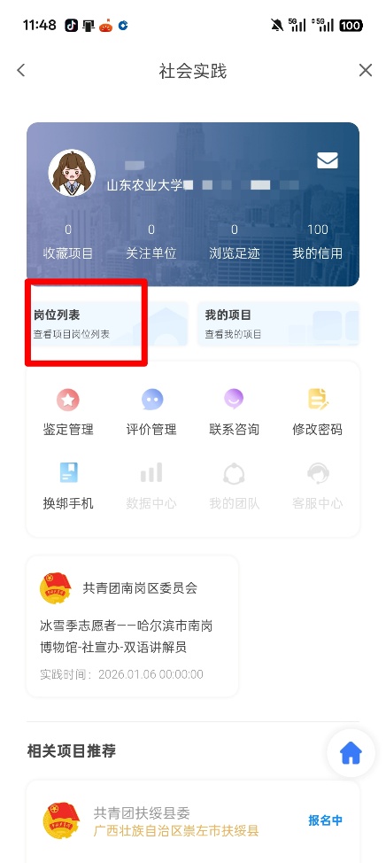 下载【“到梦空间”APP】→第一次登录时选择【激活/注册账号】→选择【激活账号】(学生信息前期已经导入)→进入APP页面点击下面最左侧本校→点击【社会实践】选项→选择【岗位列表】→状态选择【报名中】,找到相关岗位并进行报名。若不是第一次登录,则输入账号密码后重复上述操作。